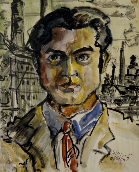 Selbstbildnis vor Industrielandschaft (Aquarell 48 x 39 cm)
